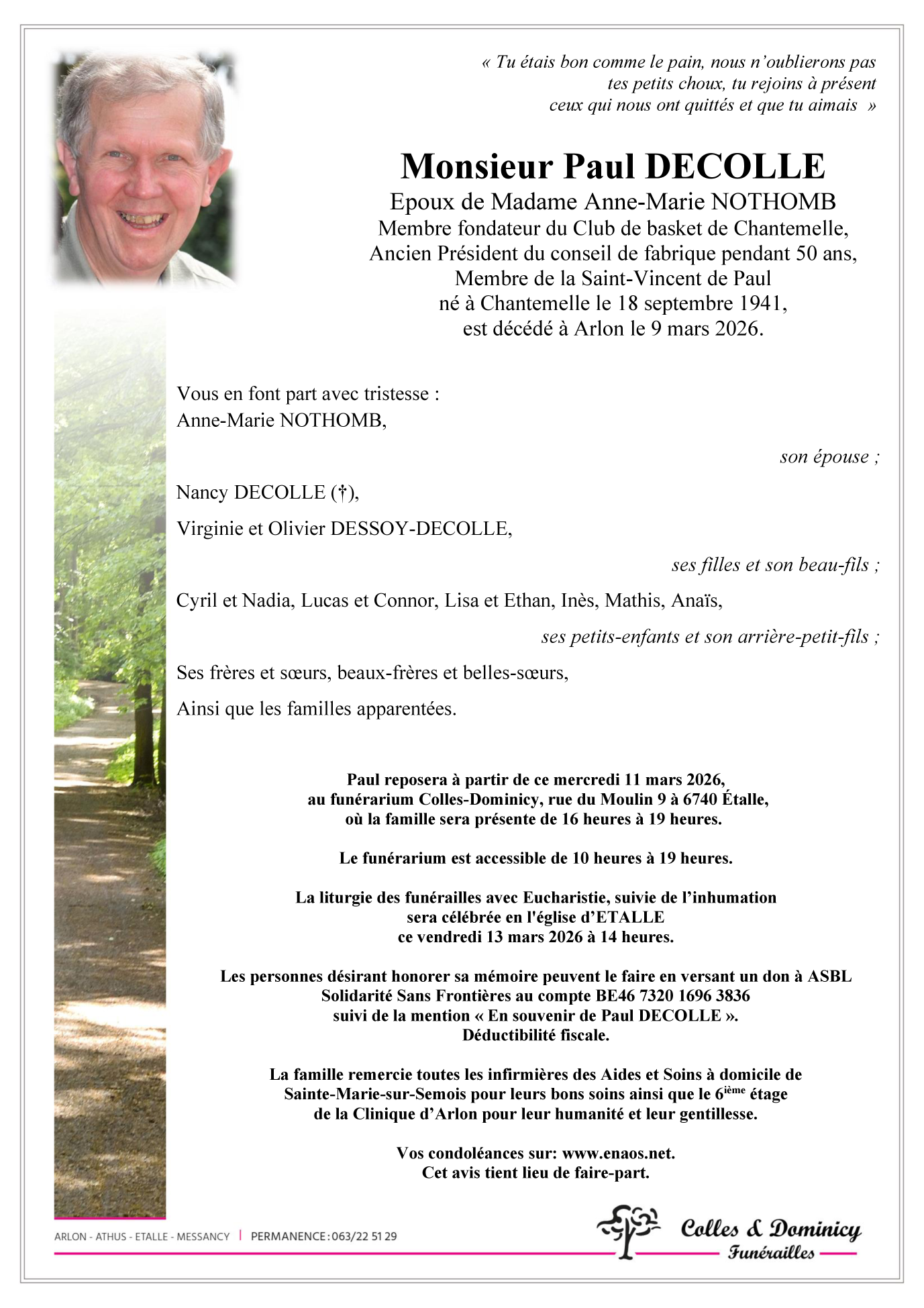 Overleden te Arlon (6700, België) op maandag 9 maart 2026 op 84-jarige leeftijd