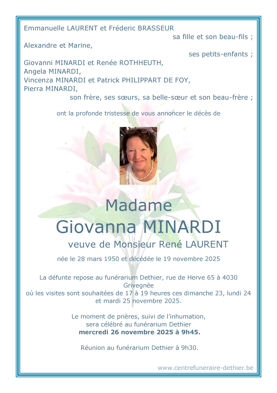 Décédée à Liège (4000, Belgique) le mercredi 19 novembre 2025 à l'âge de 75 ans