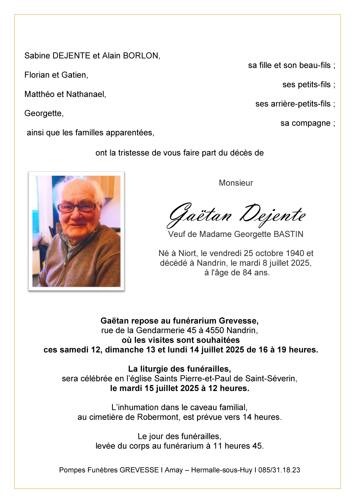 Décédé à Nandrin (4550, Belgique) le mardi 8 juillet 2025 à l'âge de 84 ans
