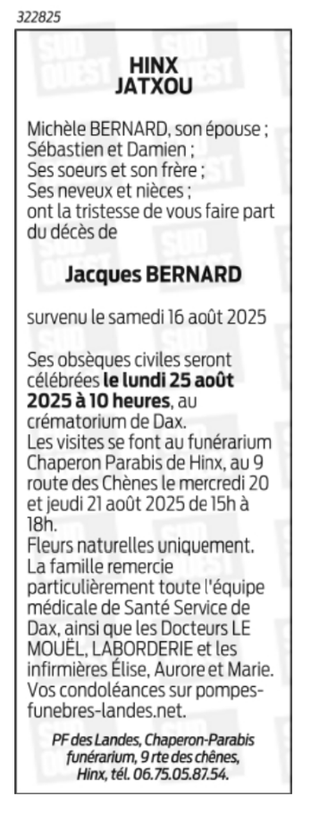 Died in Hinx (40180, France) on 16 August 2025 at the age of 82 years