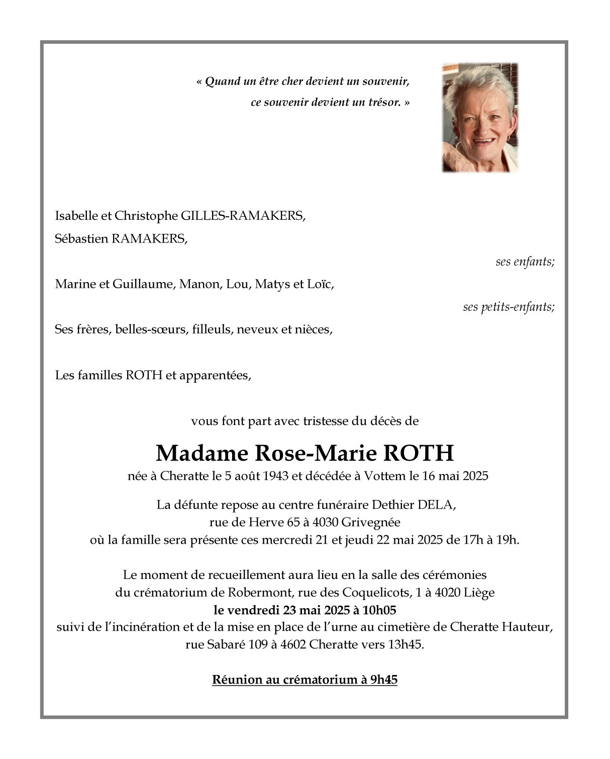 Décédée à Vottem (4041, Belgique) le vendredi 16 mai 2025 à l'âge de 81 ans