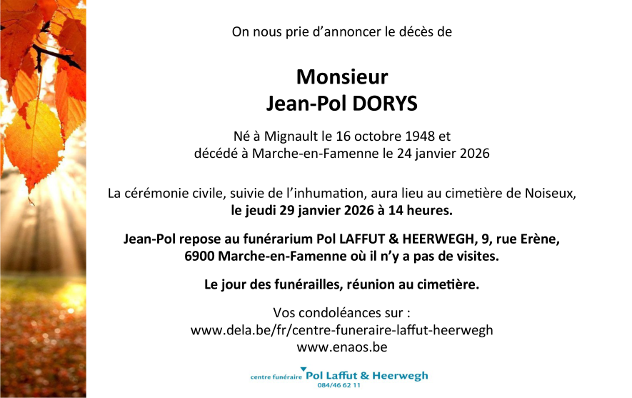 Décédé à Marche-en-Famenne (6900, Belgique) le samedi 24 janvier 2026 à l'âge de 77 ans