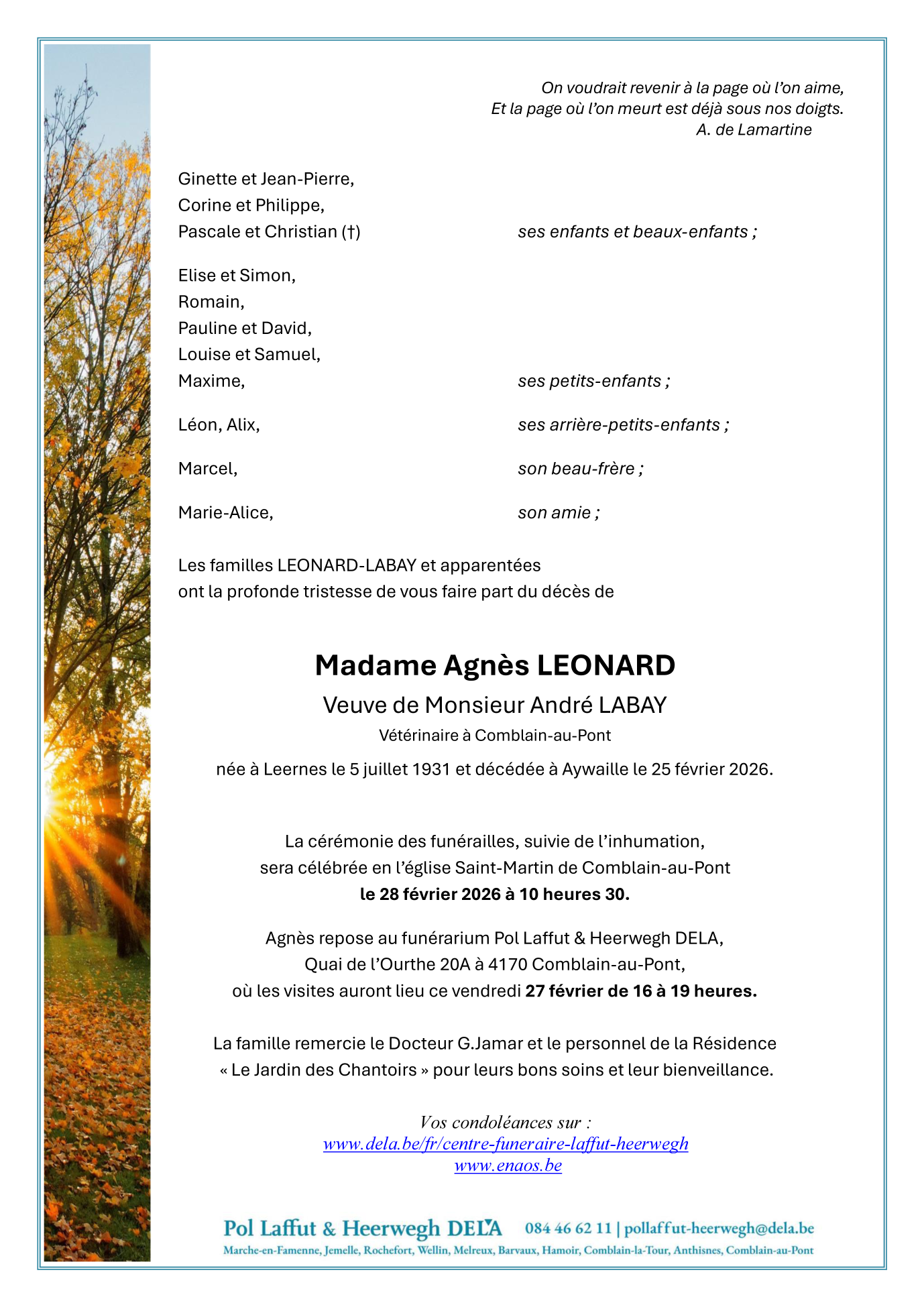 Décédée à Aywaille (4920, Belgique) le mercredi 25 février 2026 à l'âge de 94 ans