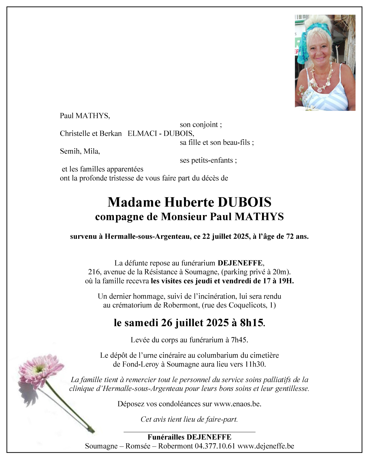 Died in Hermalle-sous-Argenteau (4681, Belgium) on 22 July 2025 at the age of 71 years