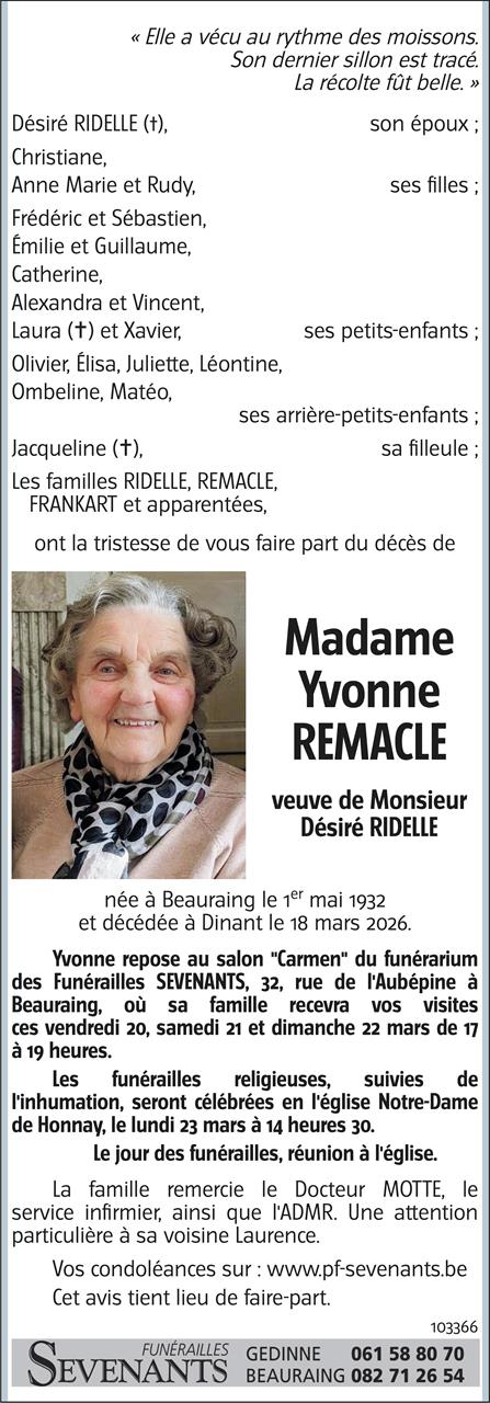 Décédée à Dinant (5500, Belgique) le mercredi 18 mars 2026 à l'âge de 93 ans