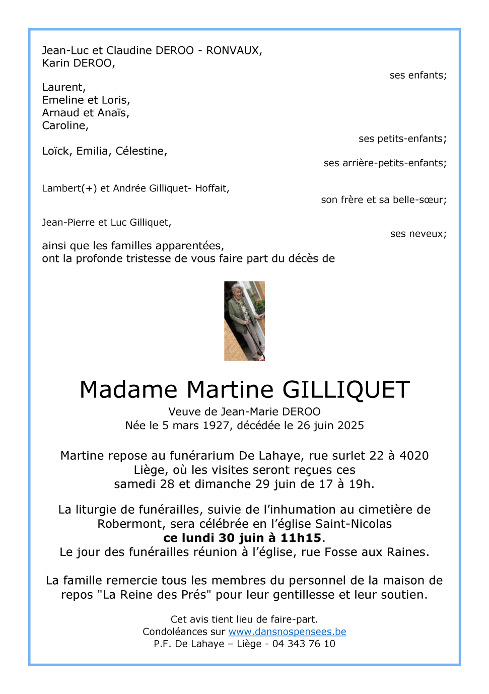 Décédée à Marche-en-Famenne (6900, Belgique) le jeudi 26 juin 2025 à l'âge de 98 ans