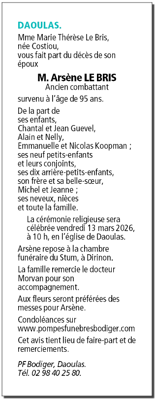 Décédé à Landerneau (29800, France) le dimanche 8 mars 2026 à l'âge de 95 ans