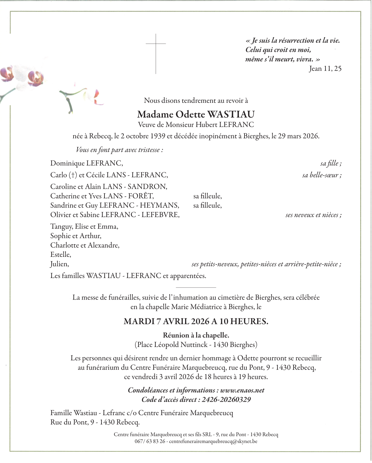 Décédée à Bierghes (1430, Belgique) le dimanche 29 mars 2026 à l'âge de 86 ans
