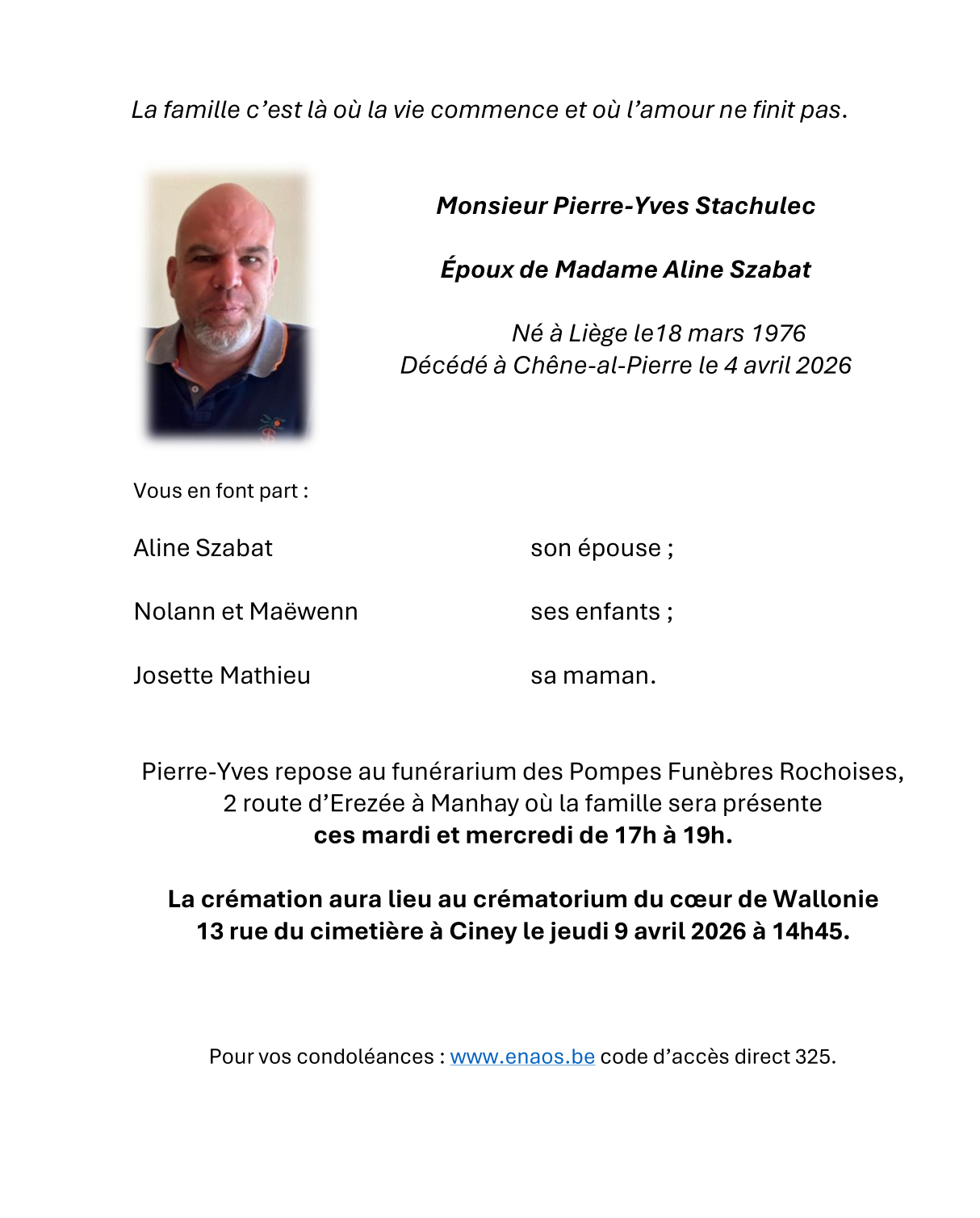 Décédé à Chêne-al-Pierre (6960, Belgique) le samedi 4 avril 2026 à l'âge de 50 ans