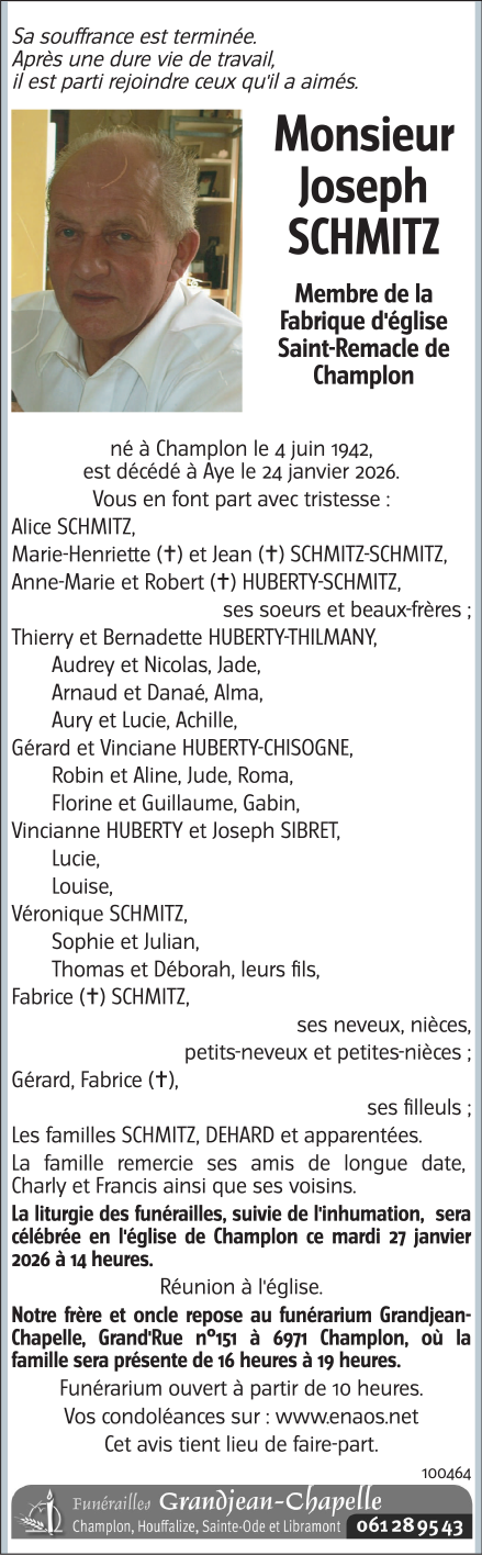 Overleden te Aye (6900, België) op zaterdag 24 januari 2026 op 83-jarige leeftijd