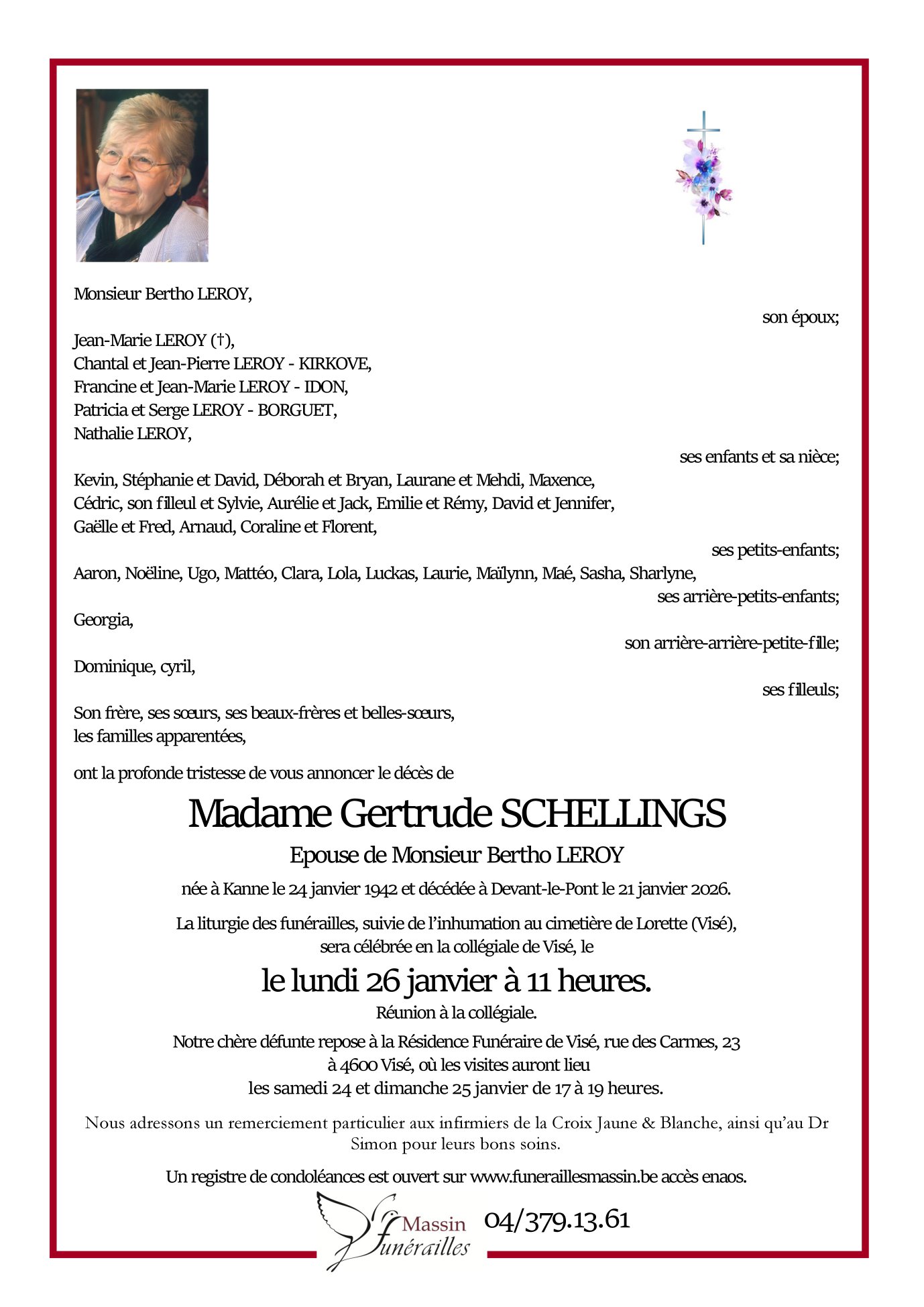 Décédée à Devant-le-Pont (Visé) (4600, Belgique) le mercredi 21 janvier 2026 à l'âge de 83 ans