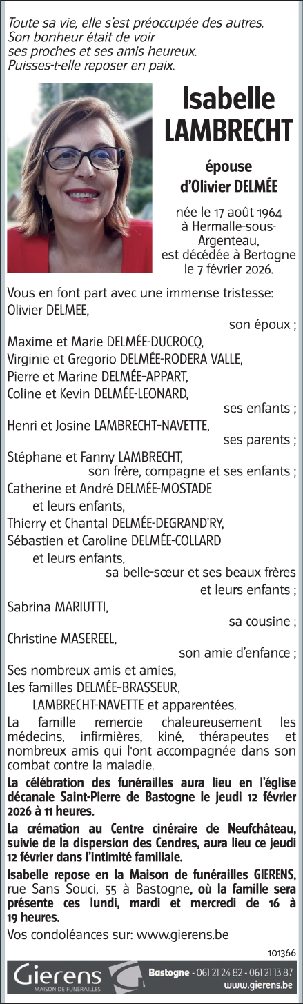 Fallecida en Bertogne (6687, Bélgica) el sábado, 7 de febrero de 2026 a la edad de 61 años