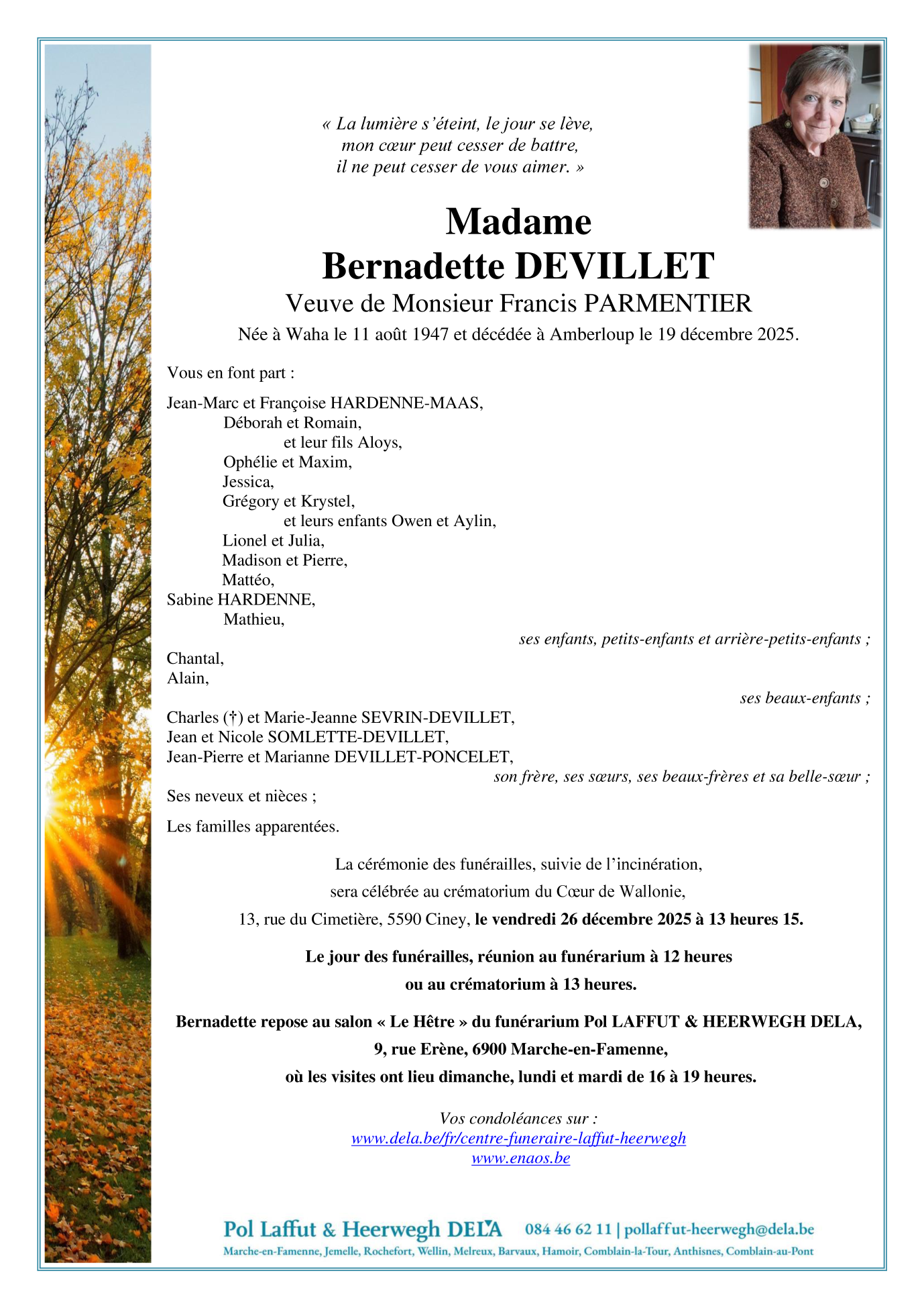 Décédée à Amberloup (6680, Belgique) le vendredi 19 décembre 2025 à l'âge de 78 ans