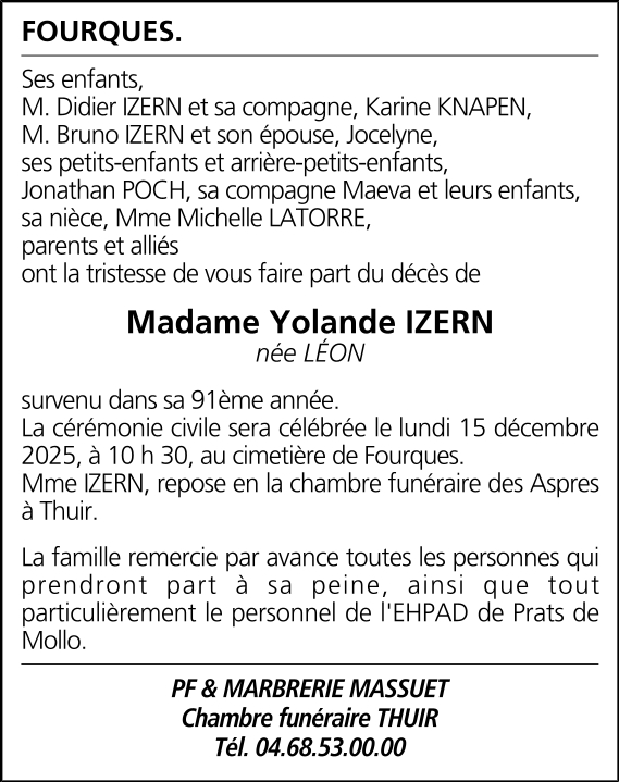 Décédée à Prats-de-Mollo-la-Preste (66230, France) le vendredi 12 décembre 2025 à l'âge de 90 ans