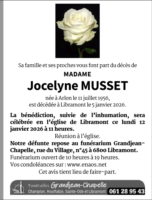 Overleden te Libramont (6800, België) op maandag 5 januari 2026 op 69-jarige leeftijd