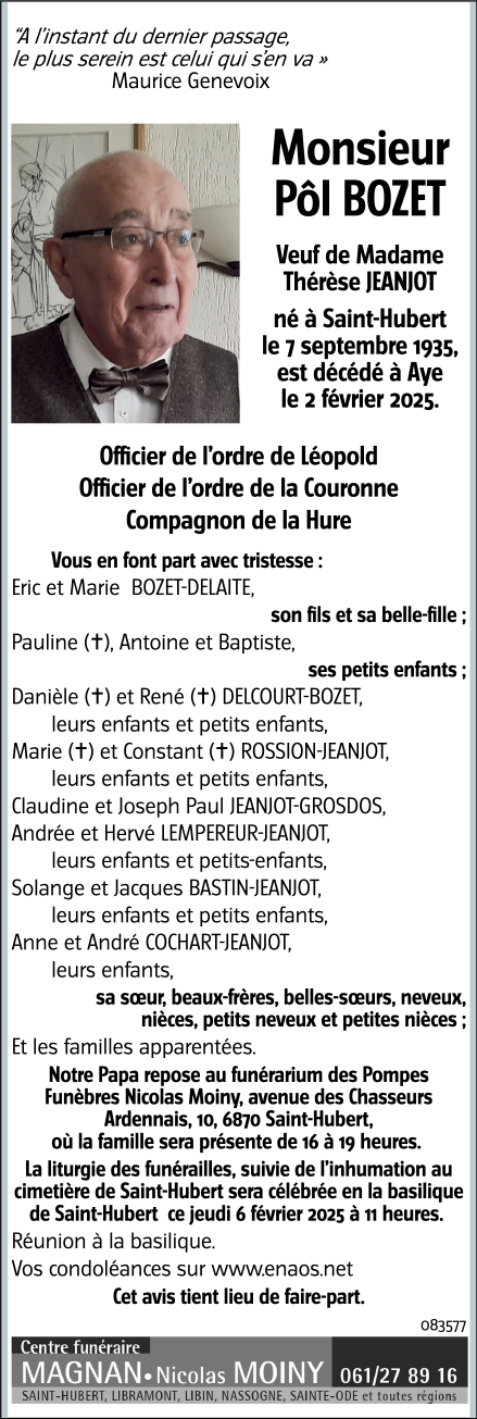 Décédé à Aye (6900, Belgique) le dimanche 2 février 2025 à l'âge de 89 ans