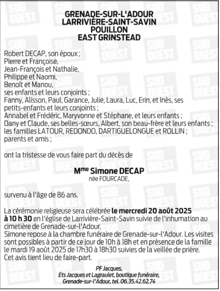 Décédée à Grenade-sur-l'Adour (40270, France) le jeudi 14 août 2025 à l'âge de 86 ans