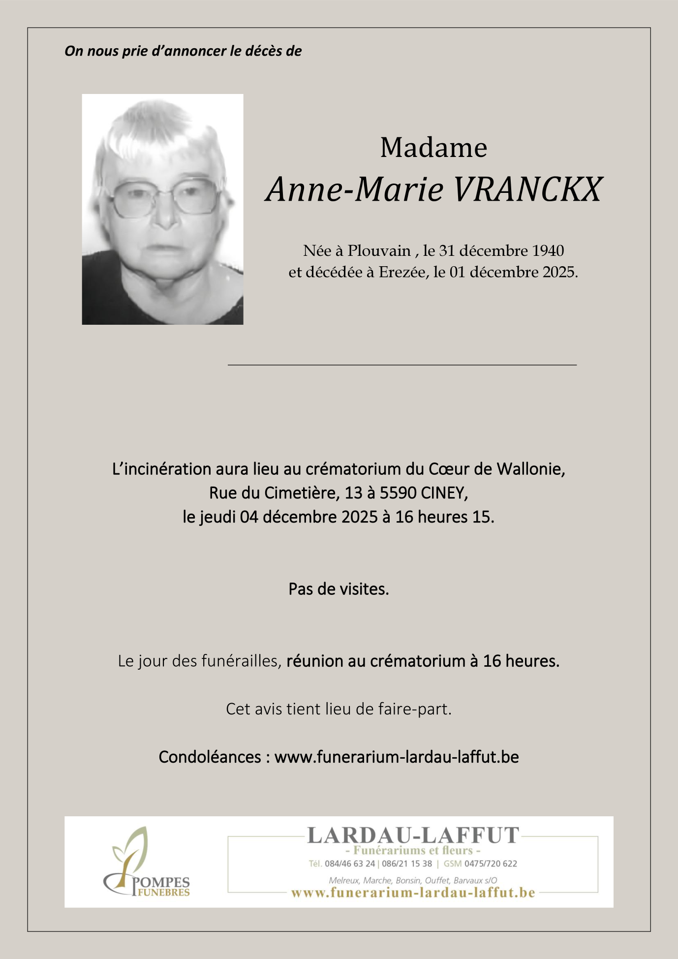 Décédée à Erezée (6997, Belgique) le lundi 1 décembre 2025 à l'âge de 84 ans