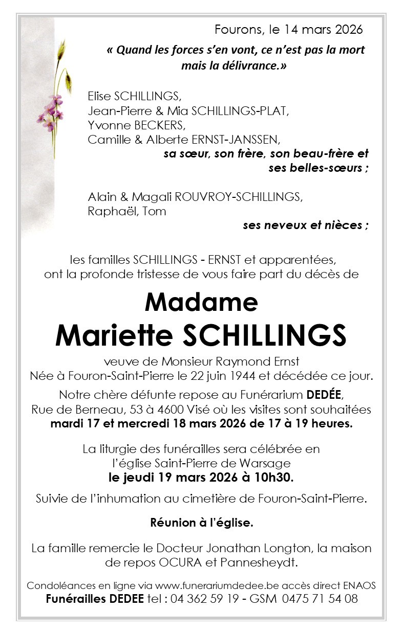 Décédée à Montzen (4850, Belgique) le samedi 14 mars 2026 à l'âge de 81 ans