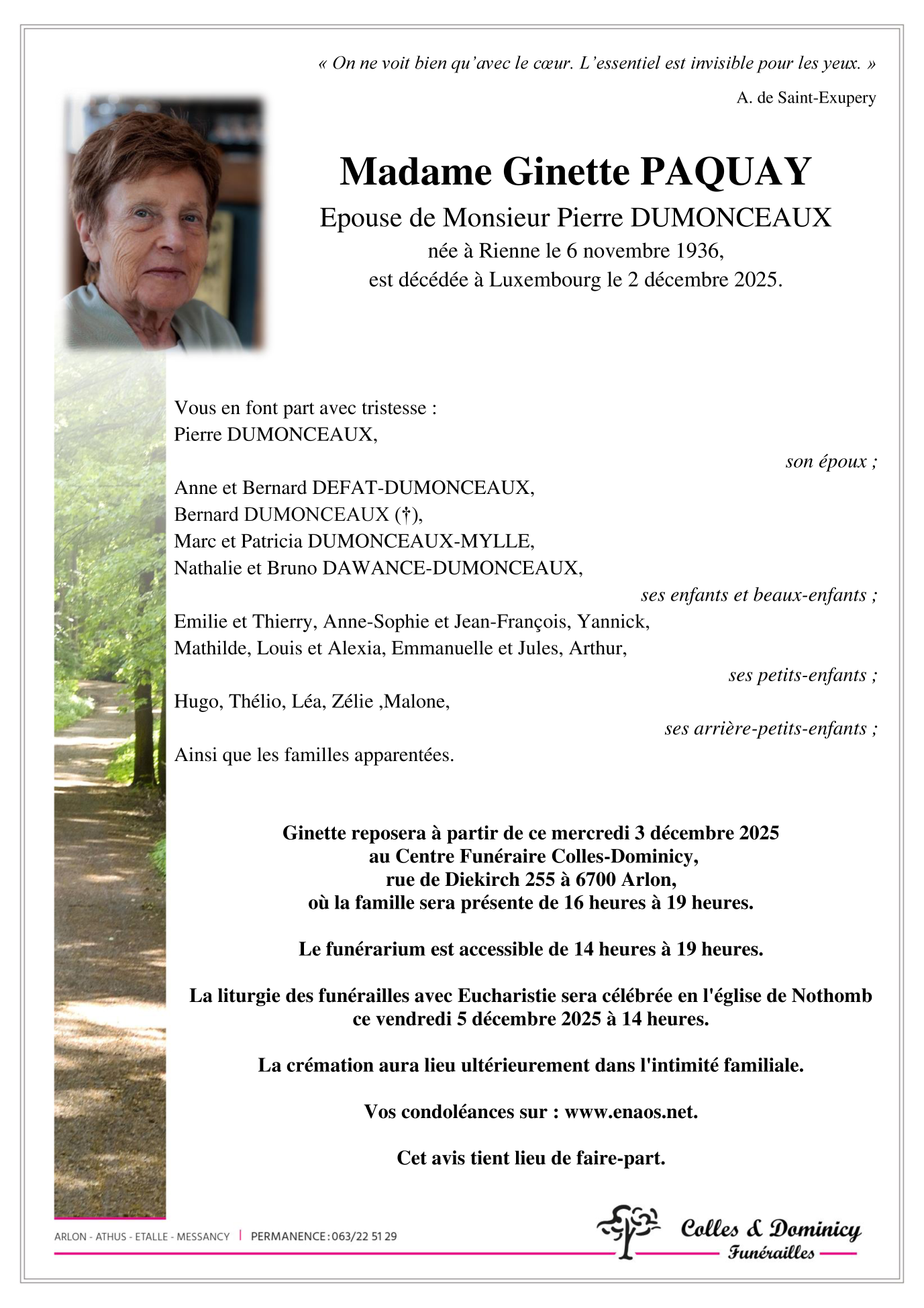 Née à Rienne (5575, Belgique) le vendredi 6 novembre 1936