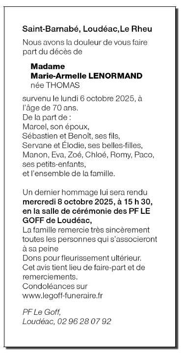 Fallecida en Saint-Barnabé (22600, Francia) el lunes, 6 de octubre de 2025 a la edad de 70 años