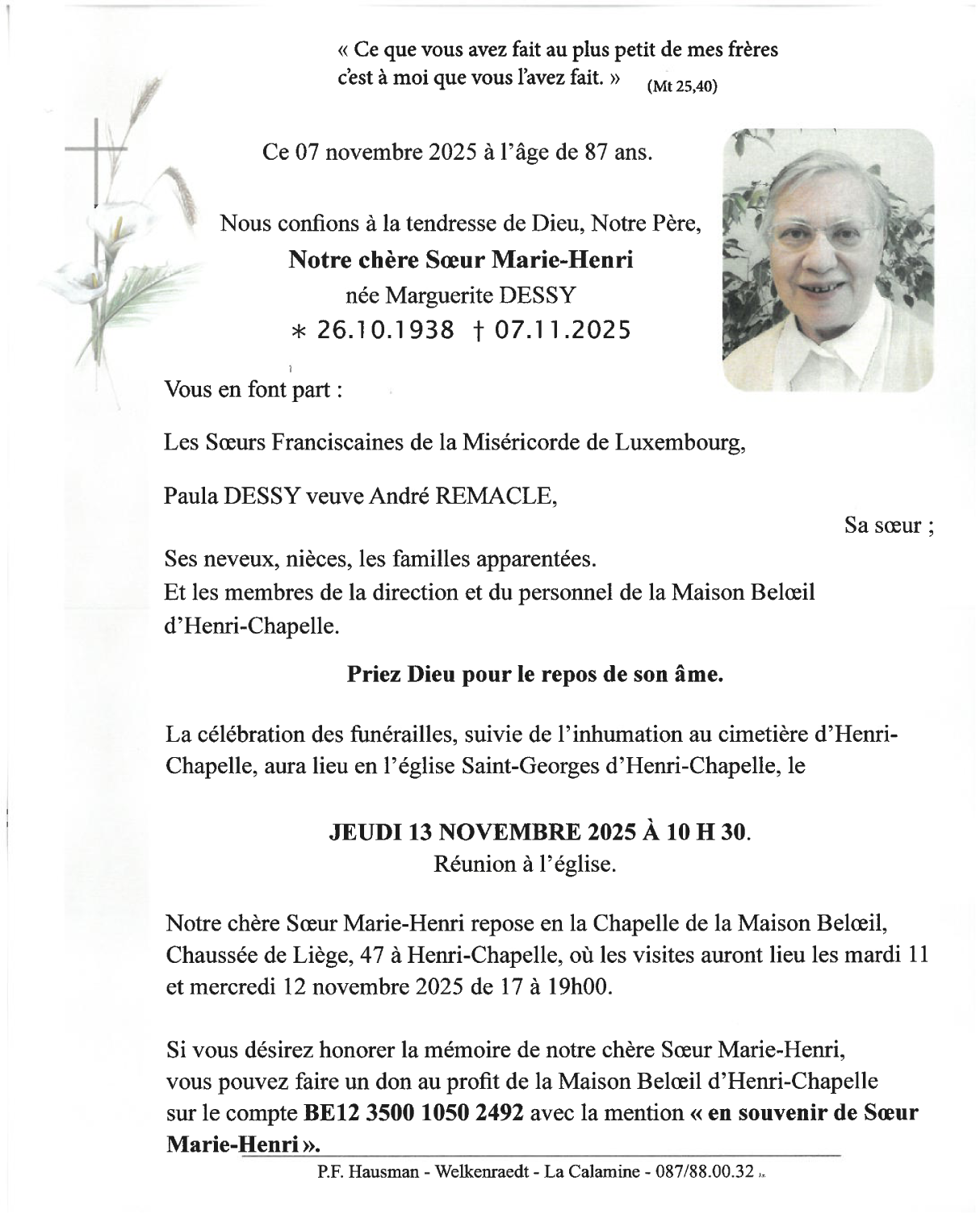 Décédée à Henri-Chapelle (4841, Belgique) le vendredi 7 novembre 2025 à l'âge de 87 ans