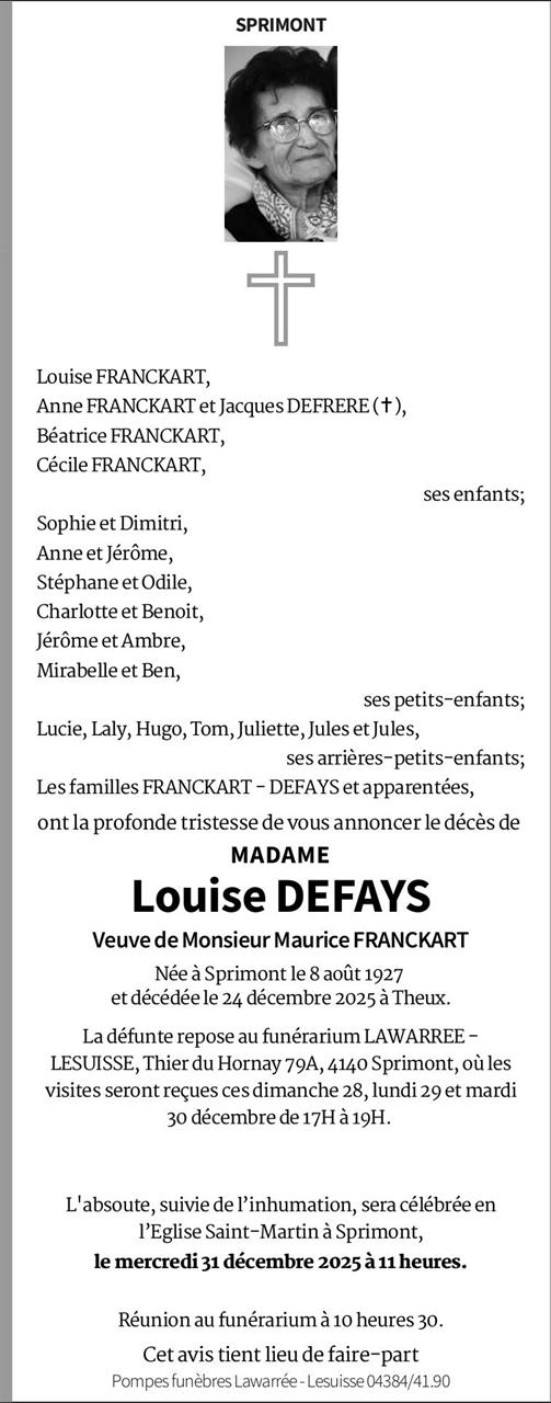 Décédée à Theux (4910, Belgique) le mercredi 24 décembre 2025 à l'âge de 98 ans
