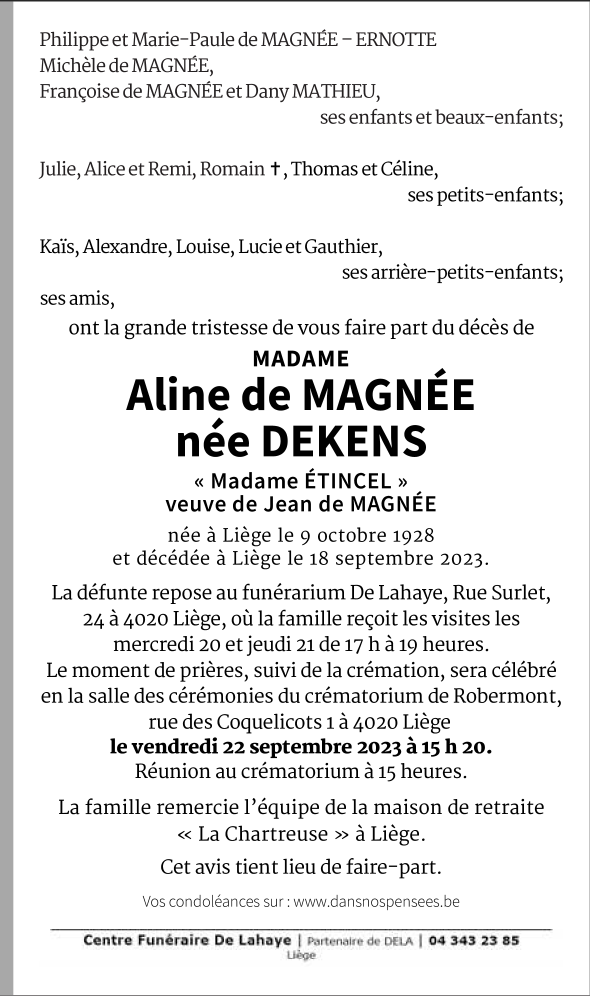 Décédée à Liège (4020, Belgique) le lundi 18 septembre 2023 à l'âge de 94 ans