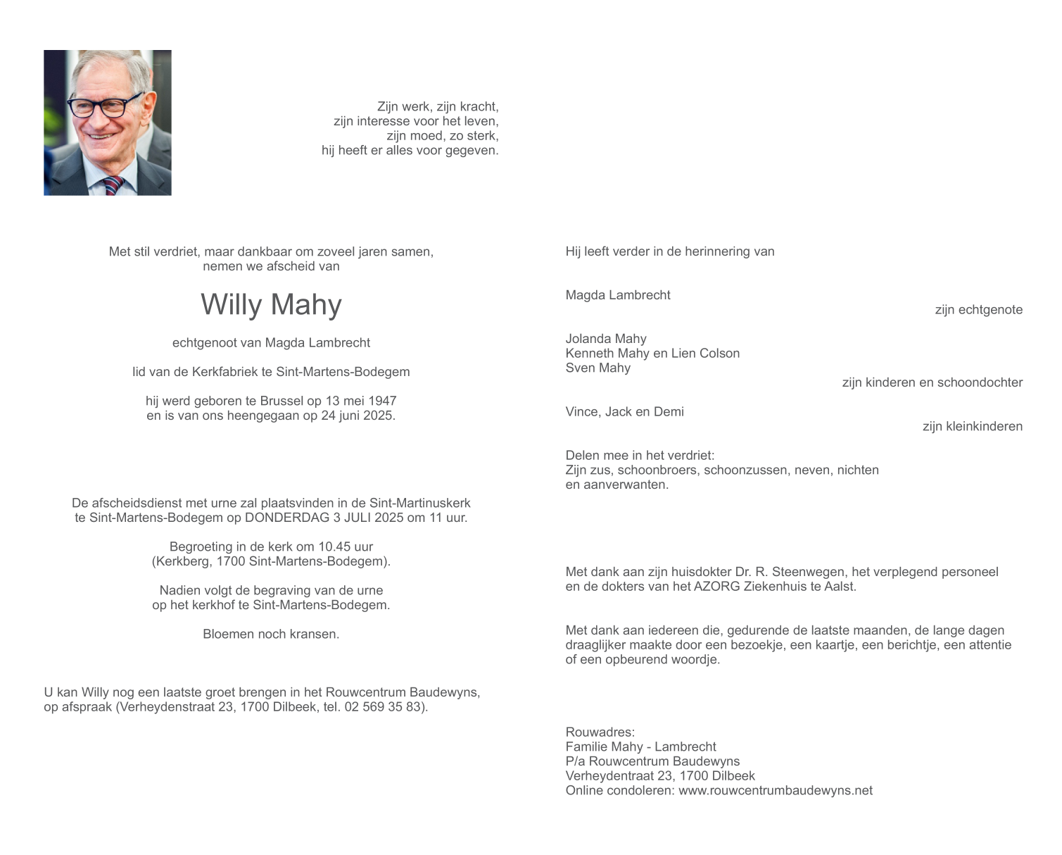 Décédé à Aalst (9300, Belgique) le mardi 24 juin 2025 à l'âge de 78 ans