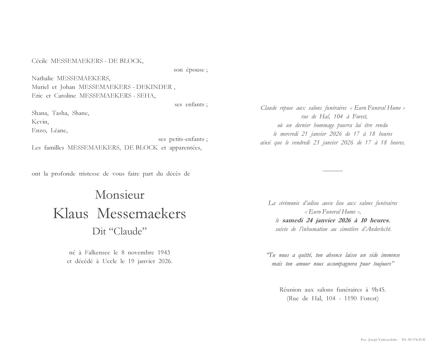 Décédé à Uccle (1180, Belgique) le lundi 19 janvier 2026 à l'âge de 82 ans