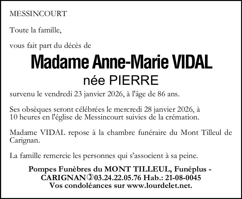 | Madame Anne-Marie VIDAL née PIERREDomiciliée à Messincourt (08110, France) Née à Pouru-Saint-Remy (08140, France) le dimanche 17 décembre 1939 Décédée à Sedan (08200, France) le vendredi 23 janvier 2026 à l'âge de 86 ans Veuve de Monsieur Emile VIDAL