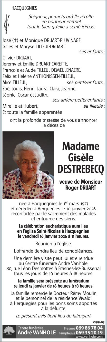 Décédée à Herquegies (7911, Belgique) le samedi 10 janvier 2026 à l'âge de 98 ans