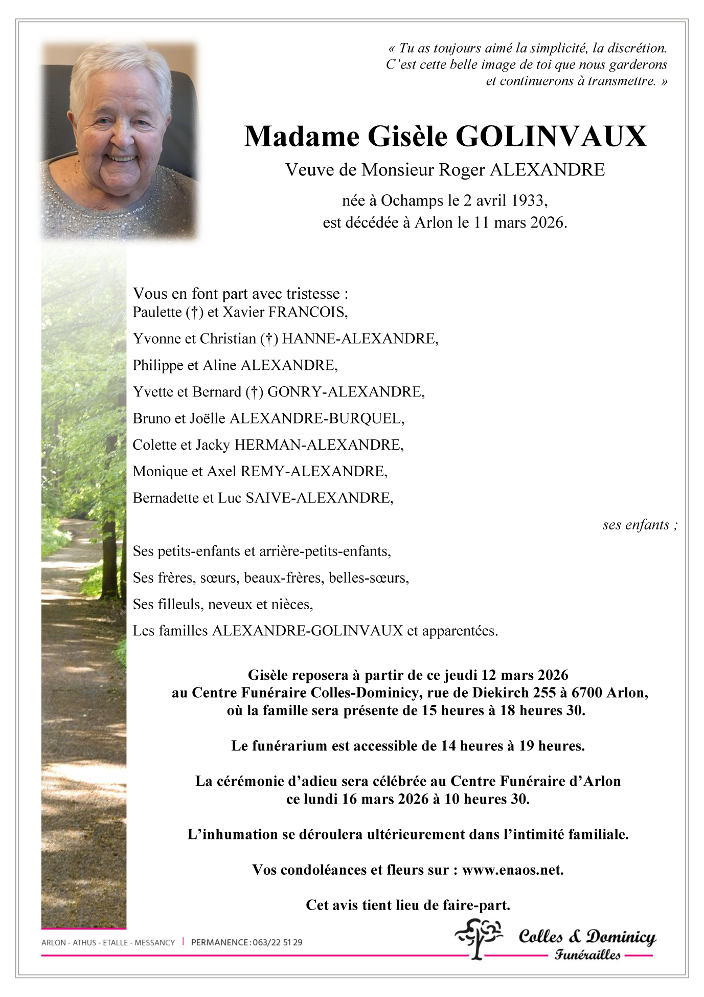 Décédée à Arlon (6700, Belgique) le mercredi 11 mars 2026 à l'âge de 92 ans