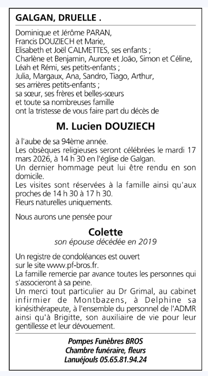 Décédé à Galgan (12220, France) le samedi 14 mars 2026 à l'âge de 93 ans
