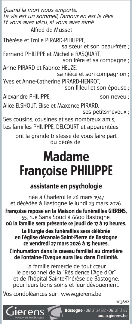 Décédée à Bastogne (6600, Belgique) le lundi 23 mars 2026 à l'âge de 78 ans