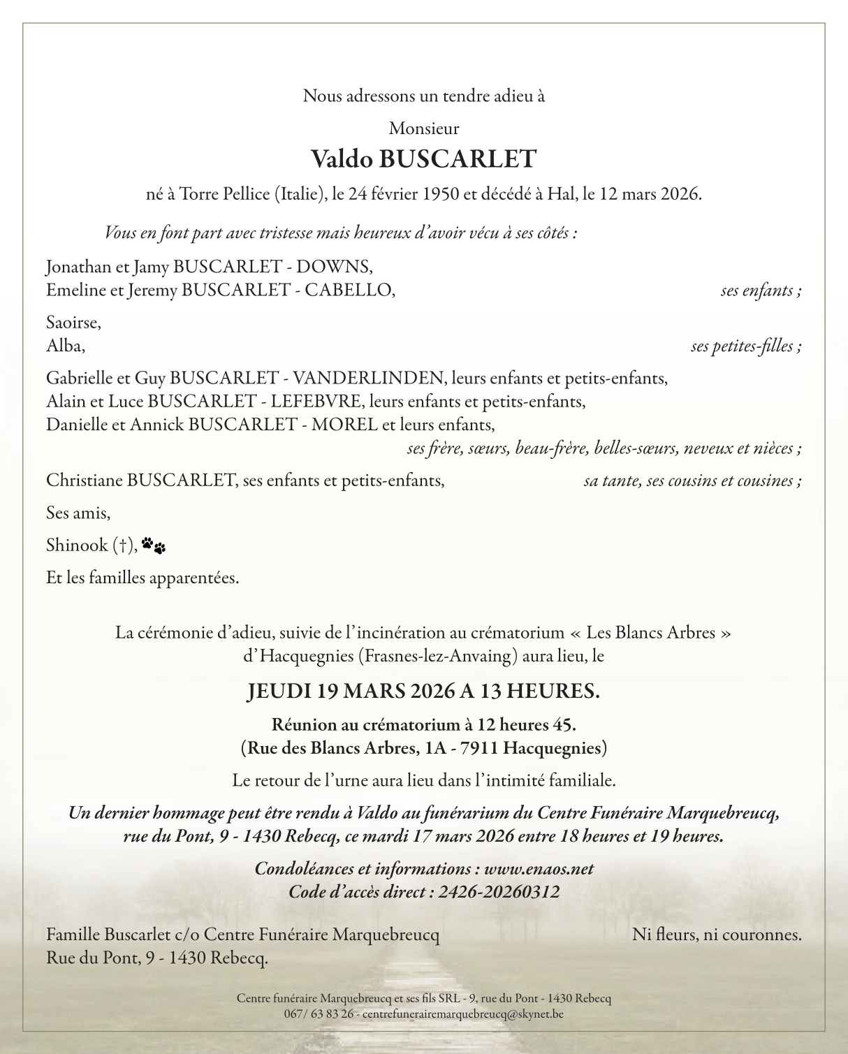 Died in Halle (1500, Belgium) on 12 March 2026 at the age of 76 years