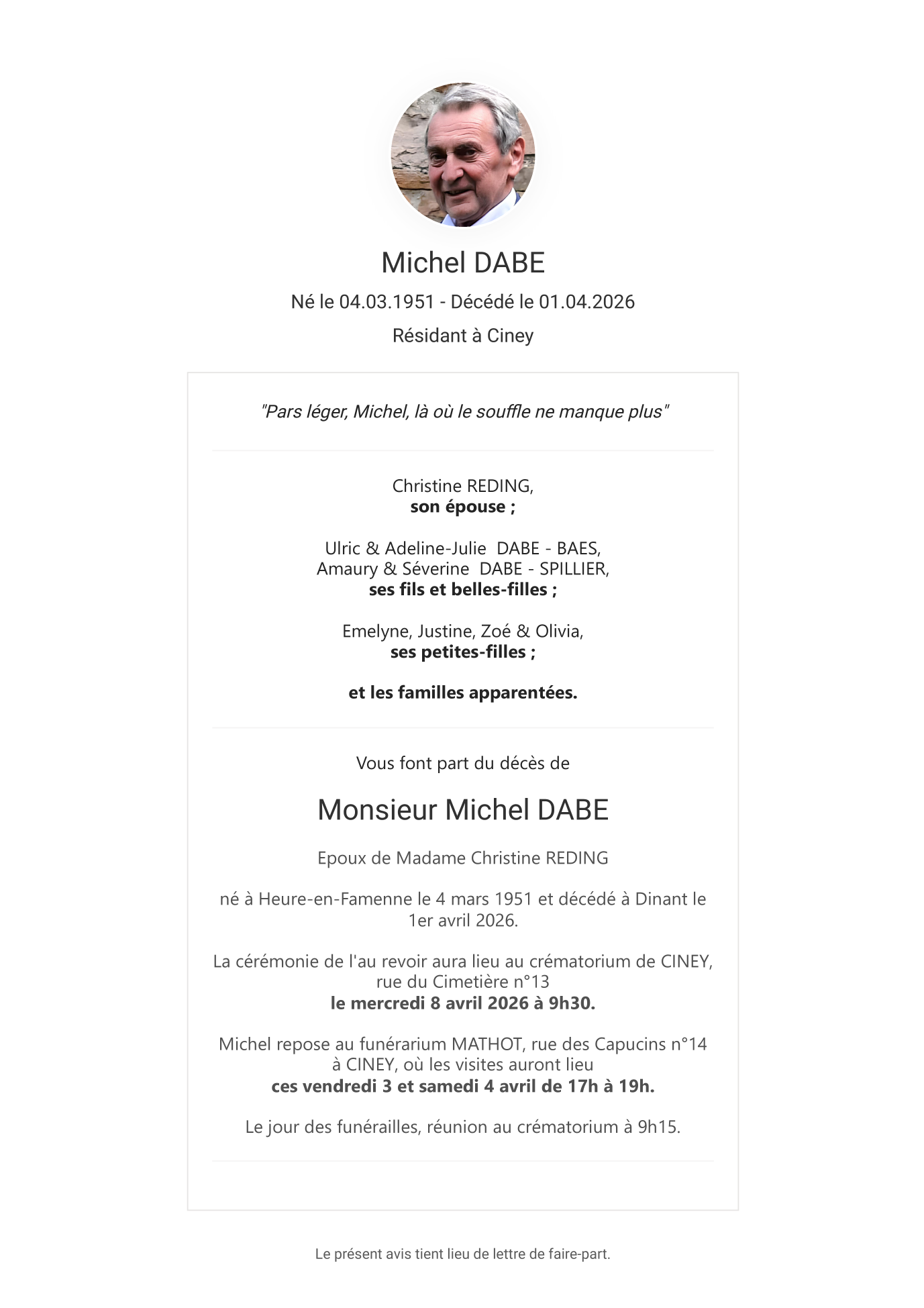 Overleden te Dinant (5500, België) op woensdag 1 april 2026 op 75-jarige leeftijd