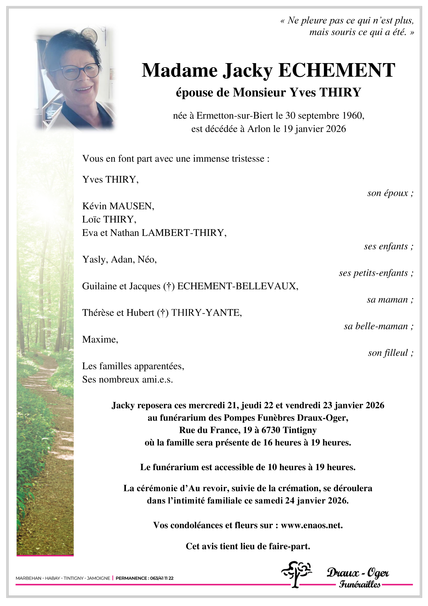 Fallecida en Arlon (6700, Bélgica) el lunes, 19 de enero de 2026 a la edad de 65 años