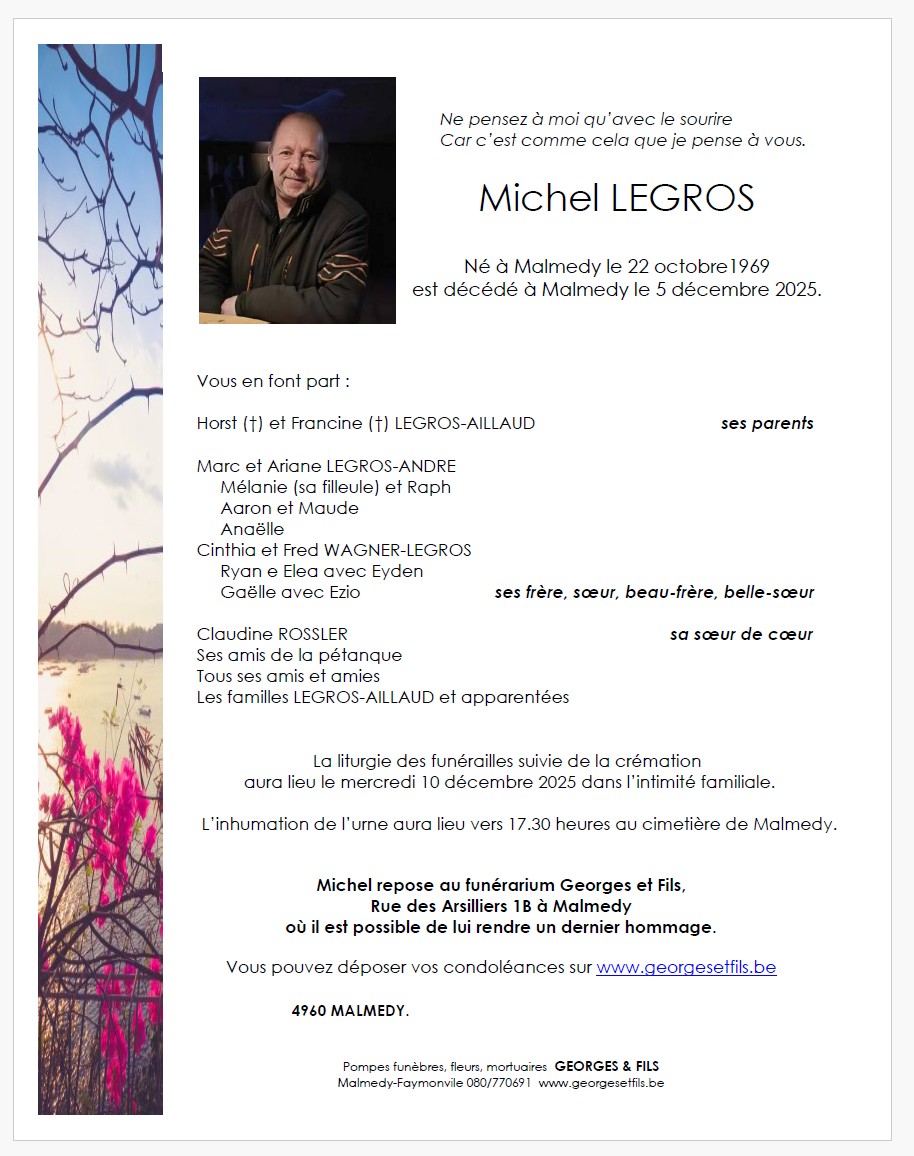 Décédé à Malmedy (4960, Belgique) le vendredi 5 décembre 2025 à l'âge de 56 ans