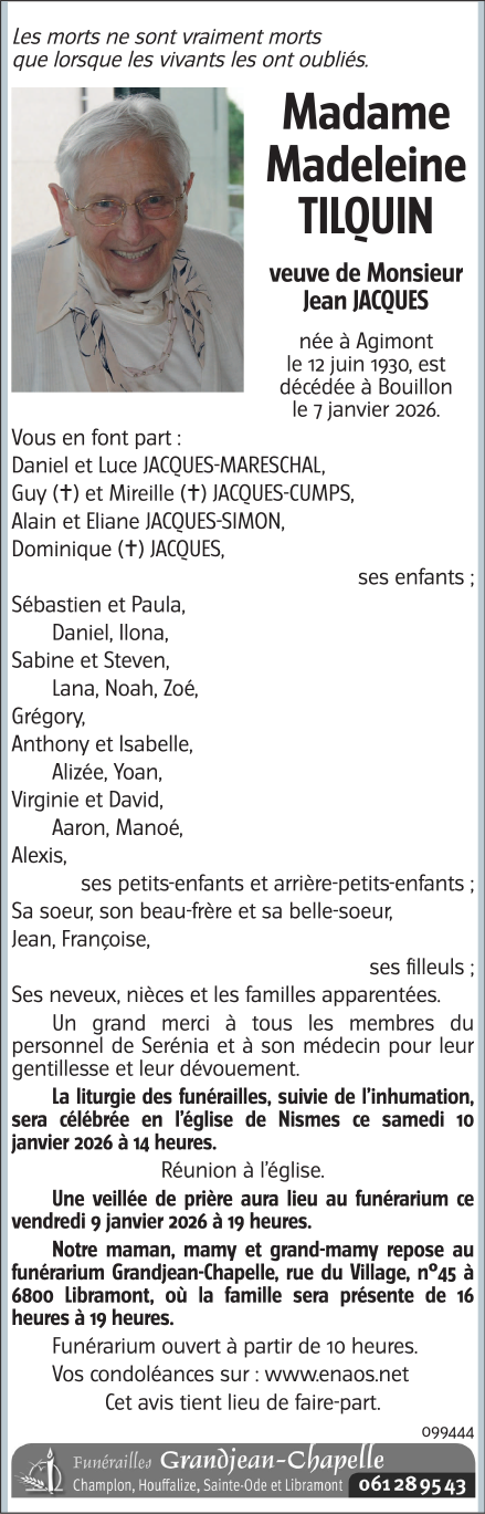 Décédée à Bouillon (6830, Belgique) le mercredi 7 janvier 2026 à l'âge de 95 ans