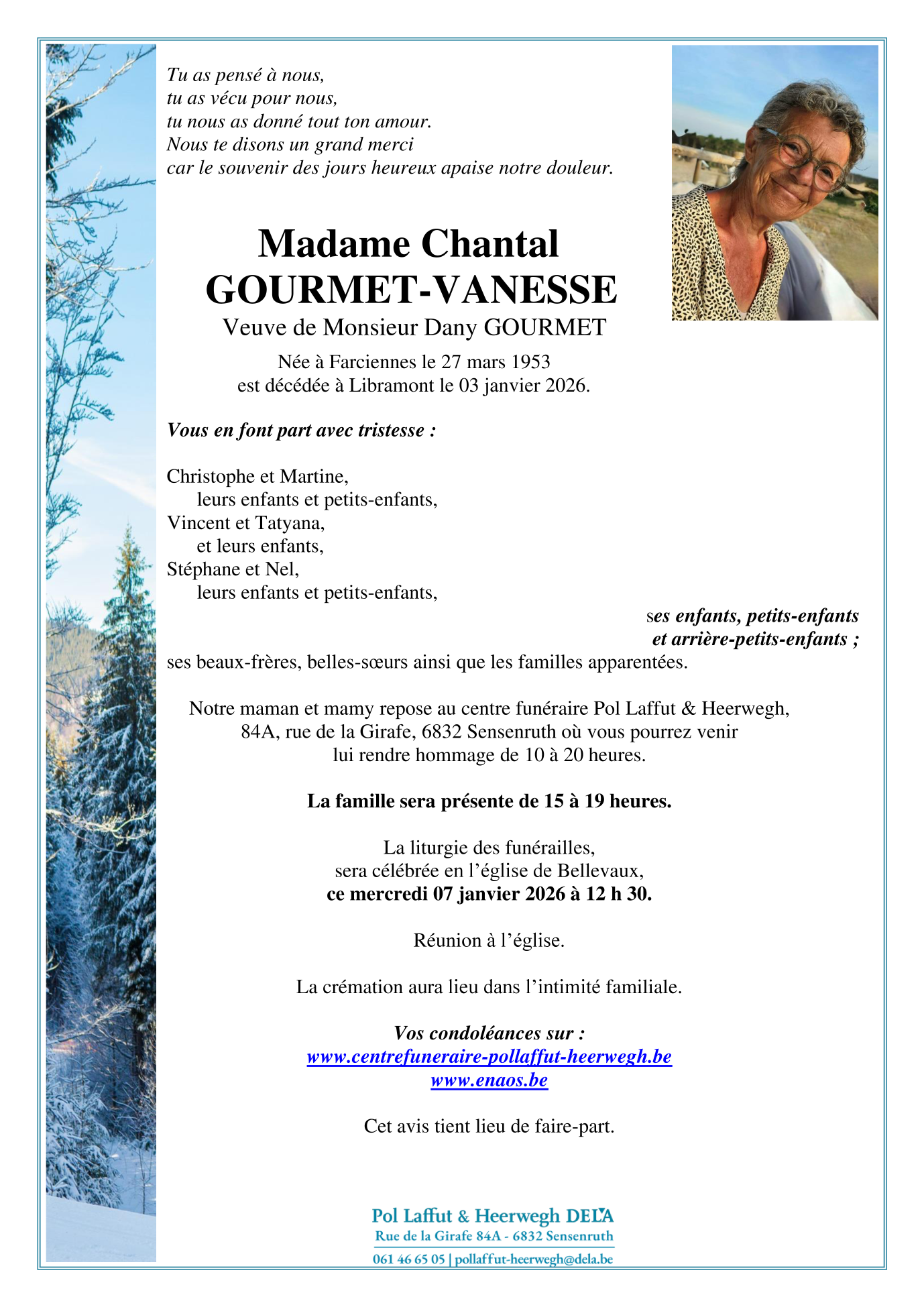 Décédée à Libramont-Chevigny (6800, Belgique) le samedi 3 janvier 2026 à l'âge de 72 ans