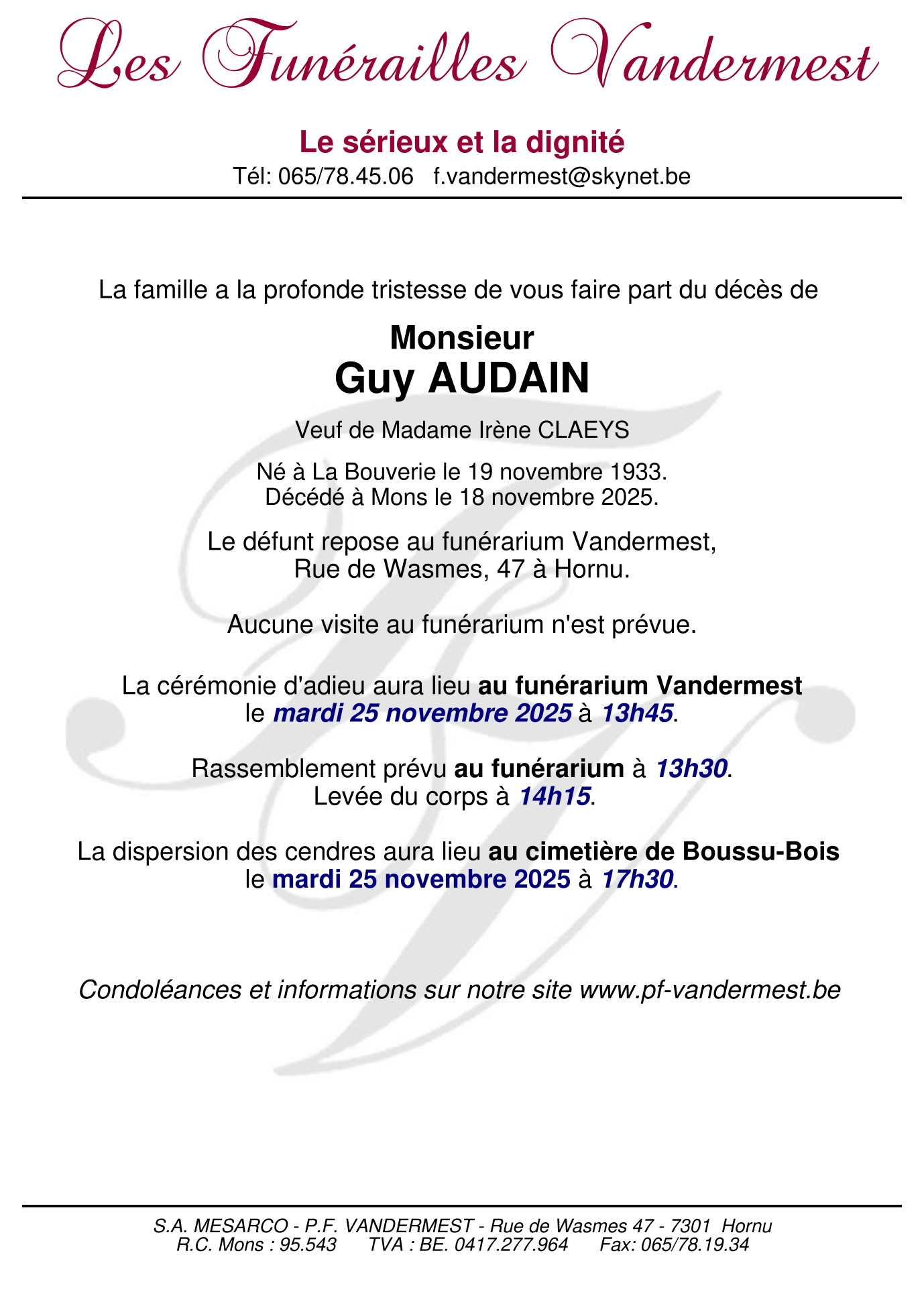 Died in Mons (7000, Belgium) on 18 November 2025 at the age of 91 years