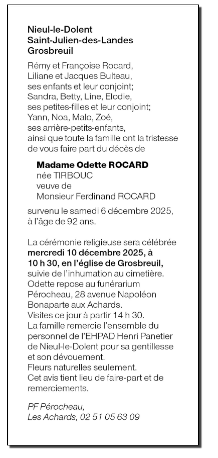 Décédée à Nieul-le-Dolent (85430, France) le samedi 6 décembre 2025 à l'âge de 92 ans