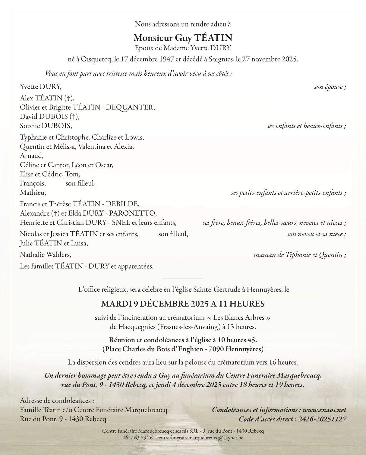 Décédé à Soignies (7060, Belgique) le jeudi 27 novembre 2025 à l'âge de 77 ans