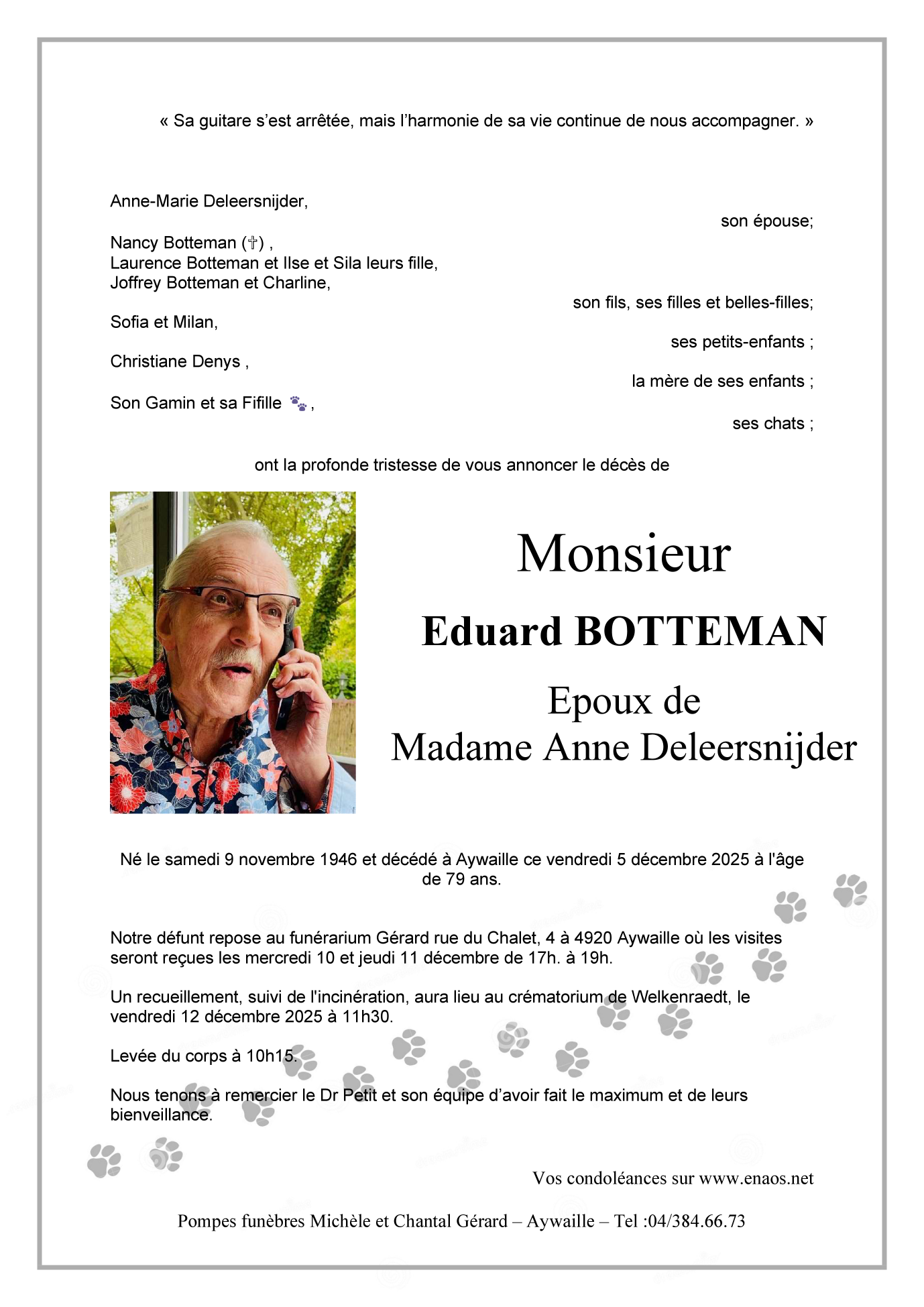 Décédé à Aywaille (4920, Belgique) le vendredi 5 décembre 2025 à l'âge de 79 ans