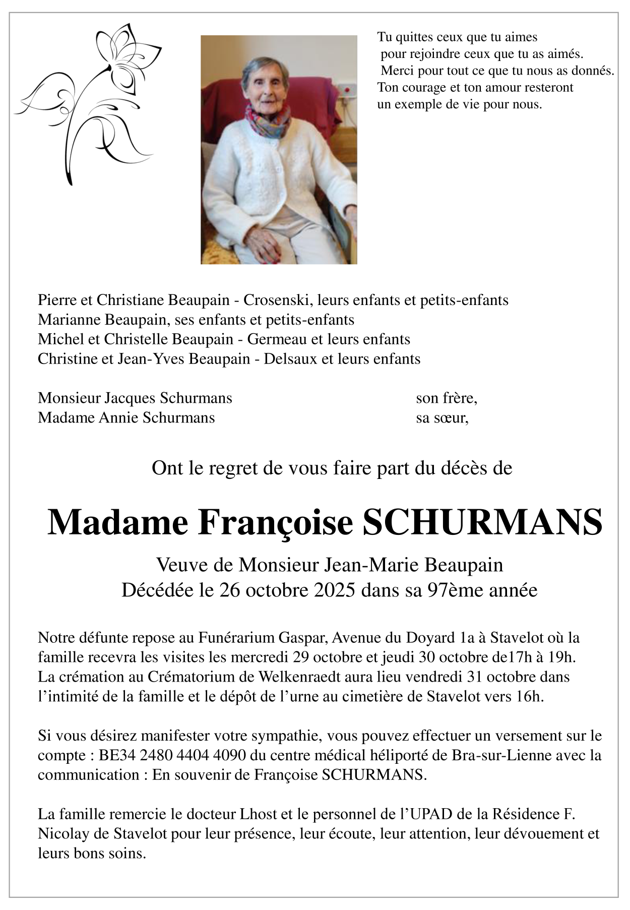 Décédée à Stavelot (4970, Belgique) le dimanche 26 octobre 2025 à l'âge de 96 ans