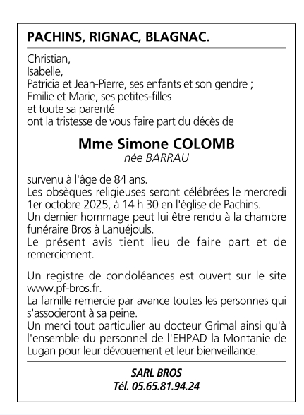 Died in Lugan (12220, France) on 29 September 2025 at the age of 84 years