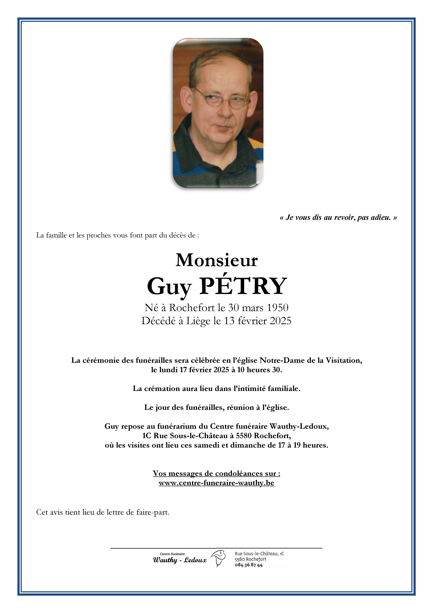 Né à Rochefort (5580, Belgique) le jeudi 30 mars 1950