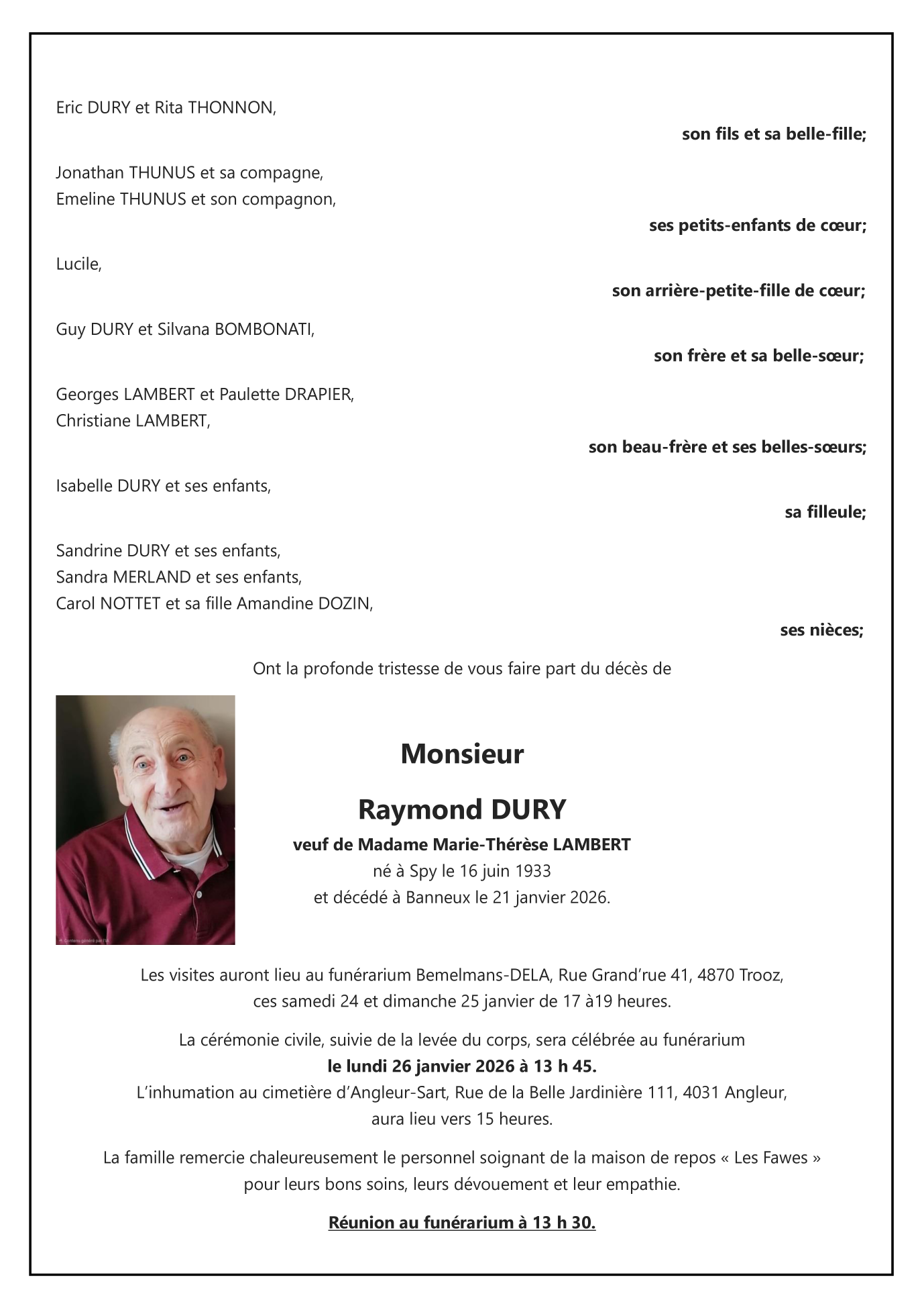 Décédé à Banneux (4141, Belgique) le mercredi 21 janvier 2026 à l'âge de 92 ans