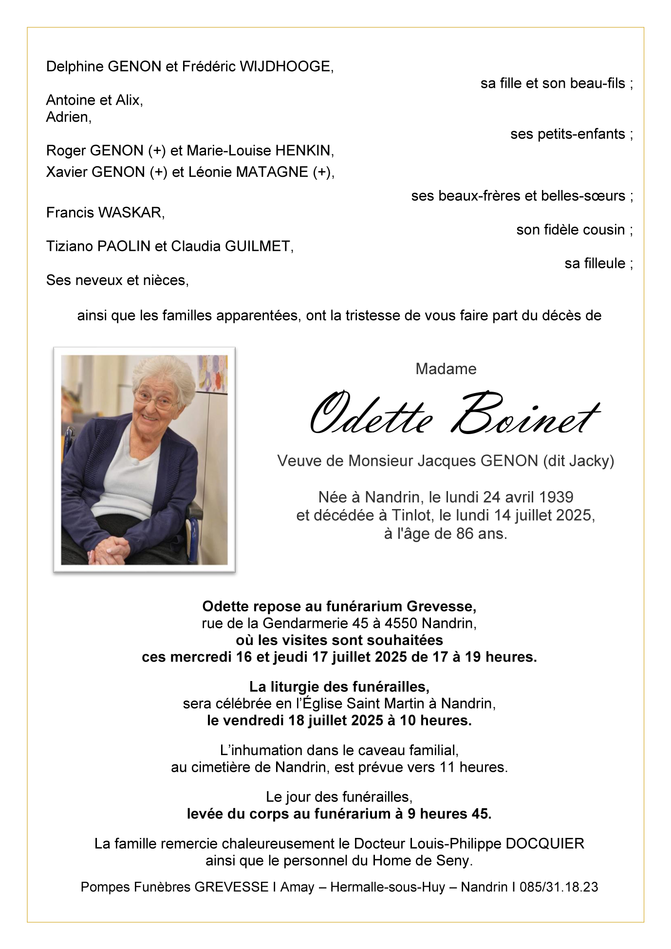 Fallecida en Seny (4557, Bélgica) el lunes, 14 de julio de 2025 a la edad de 86 años